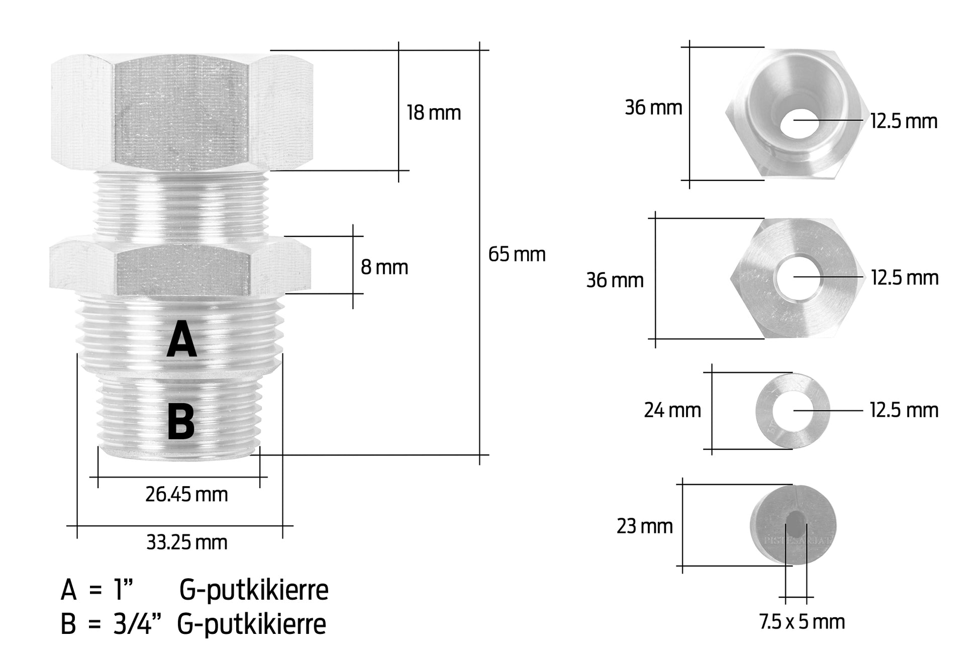 - Kierteet: 3/4" ja 1" kierteet (G-putkikierre 26.45 ja 33.25 mm ulkohalkaisija)