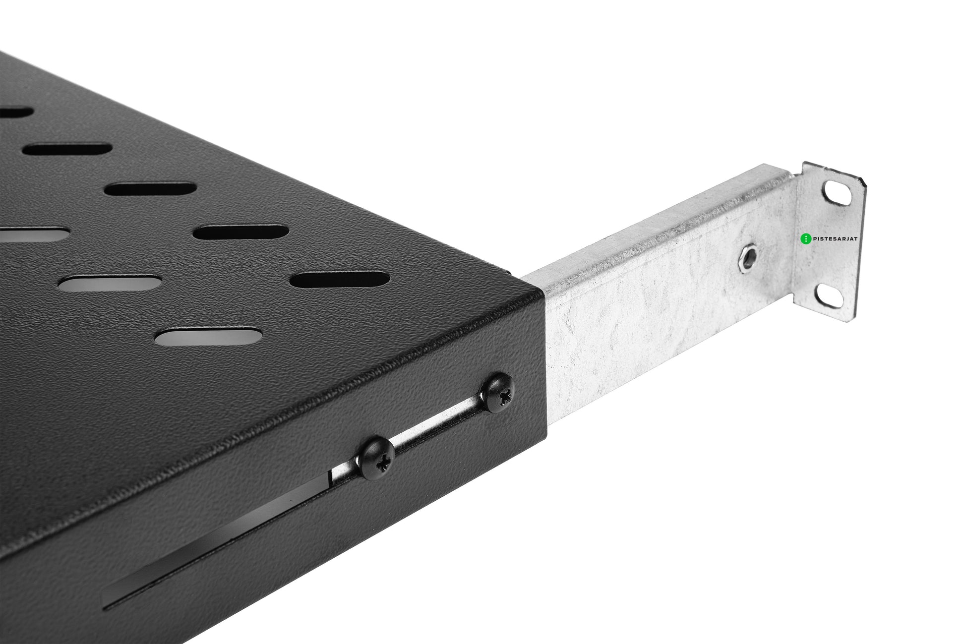 4-pistekiinnitteinen 1U kiinteä hylly jonka asennus tulee suorittaa kaapin etu- ja takaosan kiinnityskiskoihin. Kannakkeiden syvyys on säädettävissä kummastakin päädystä. Jäähdytyksen ja ilmavirtauksen mahdollistamiseksi hyllyt on varustettu tuuletusaukoilla.