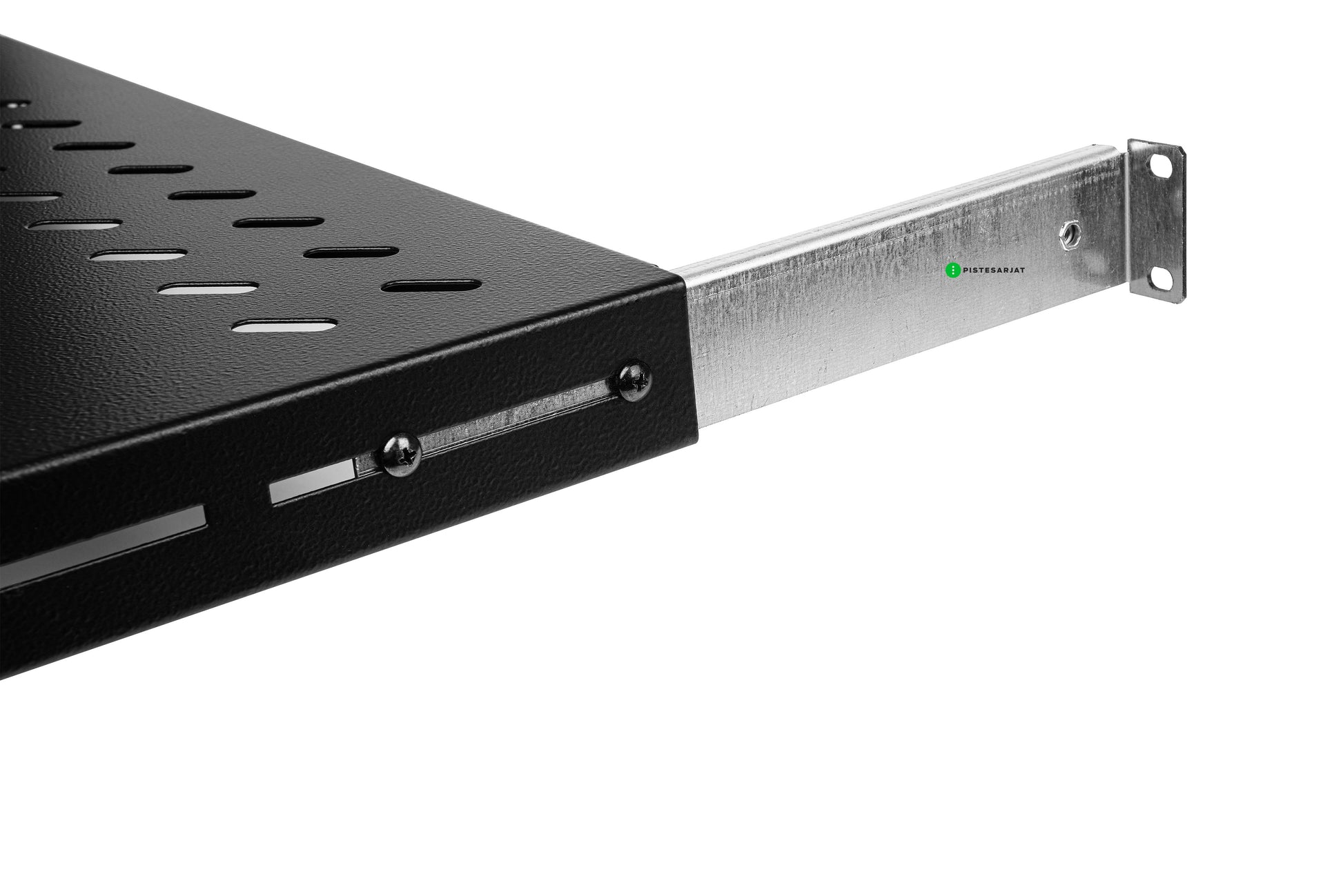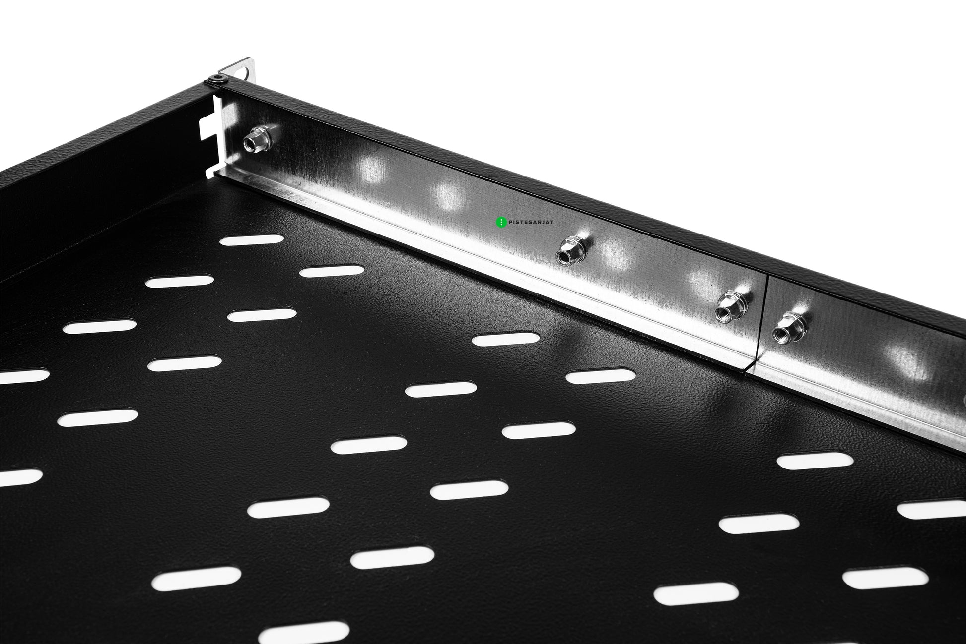 4-pistekiinnitteinen 1U kiinteä hylly jonka asennus tulee suorittaa kaapin etu- ja takaosan kiinnityskiskoihin. Kannakkeiden syvyys on säädettävissä kummastakin päädystä. Jäähdytyksen ja ilmavirtauksen mahdollistamiseksi hyllyt on varustettu tuuletusaukoilla.