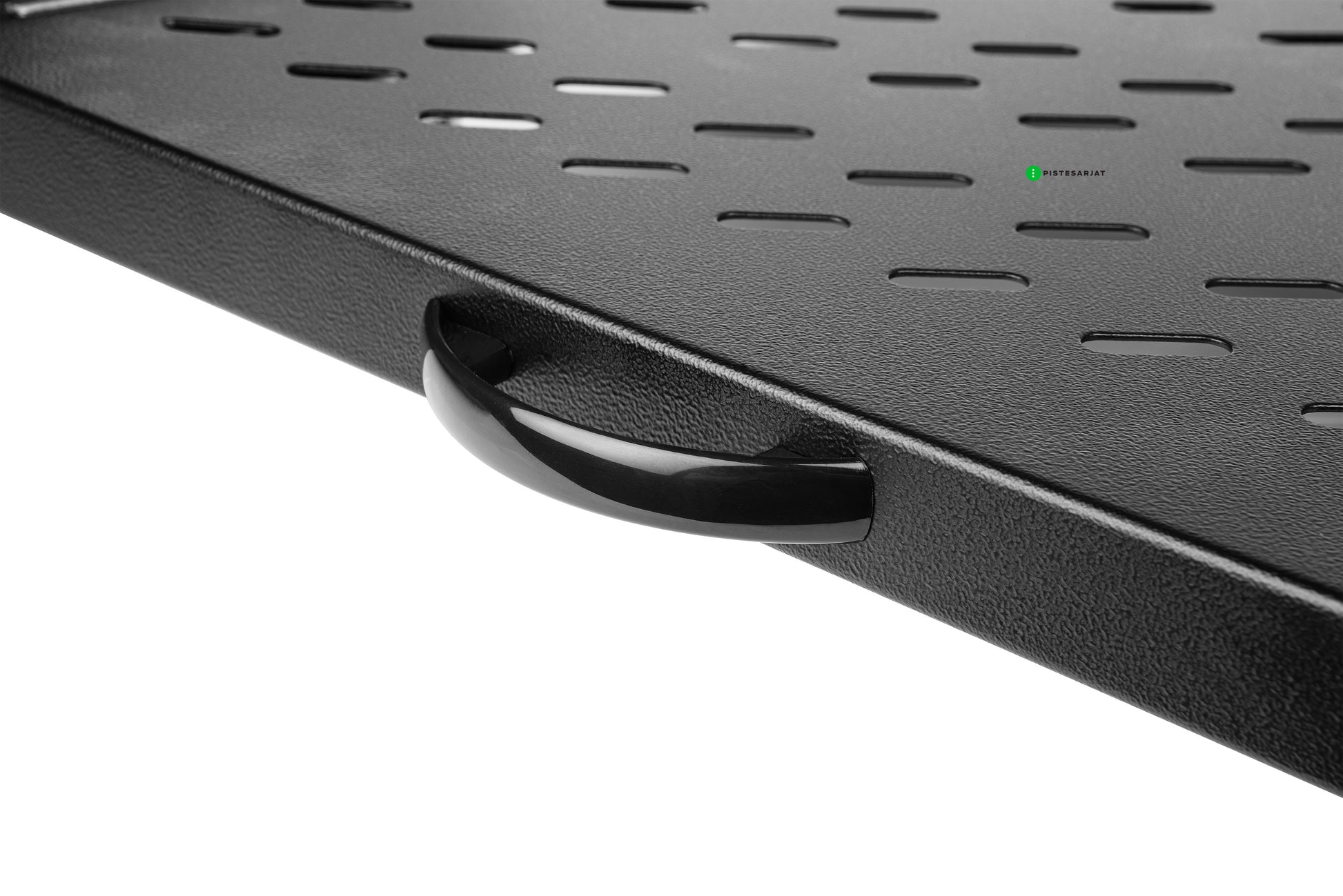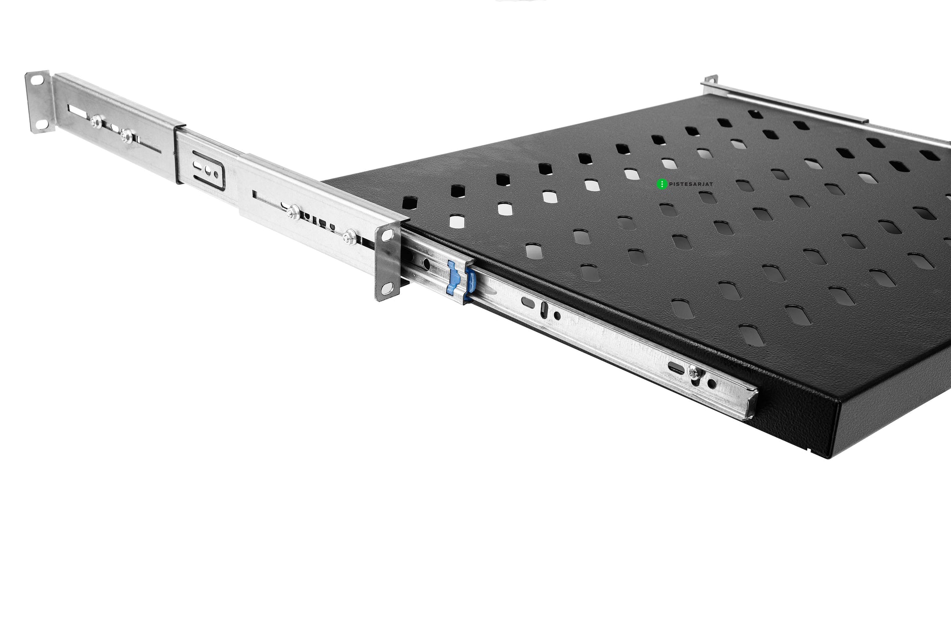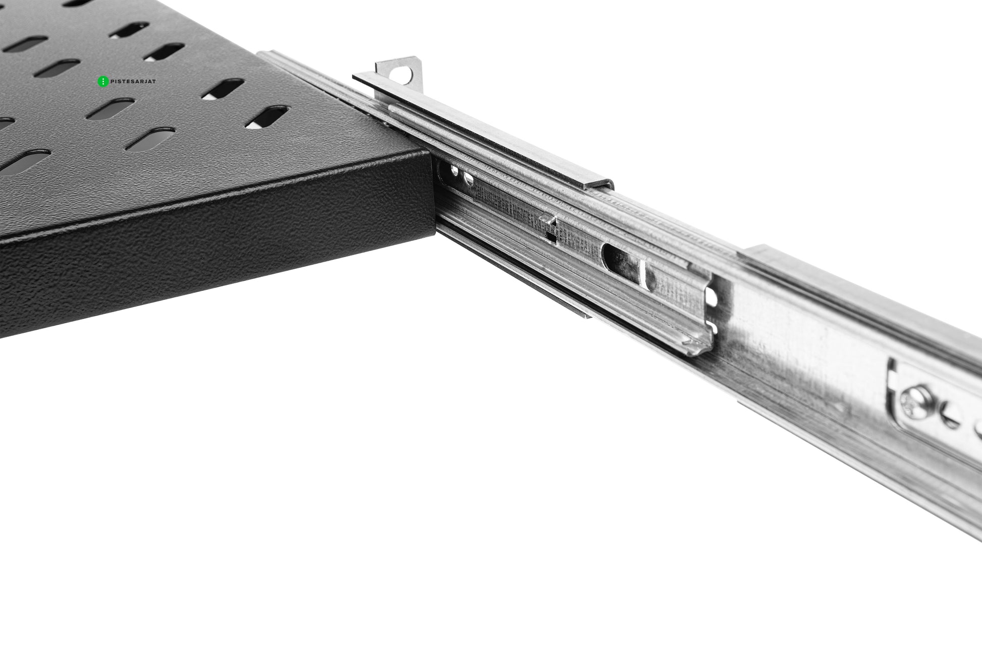4-pistekiinnitteinen 1U liukuhylly jonka asennus tulee suorittaa kaapin etu- ja takaosan kiinnityskiskoihin. Kannakkeiden syvyys on säädettävissä kummastakin päädystä. Jäähdytyksen ja ilmavirtauksen mahdollistamiseksi hyllyt on varustettu tuuletusaukoilla.