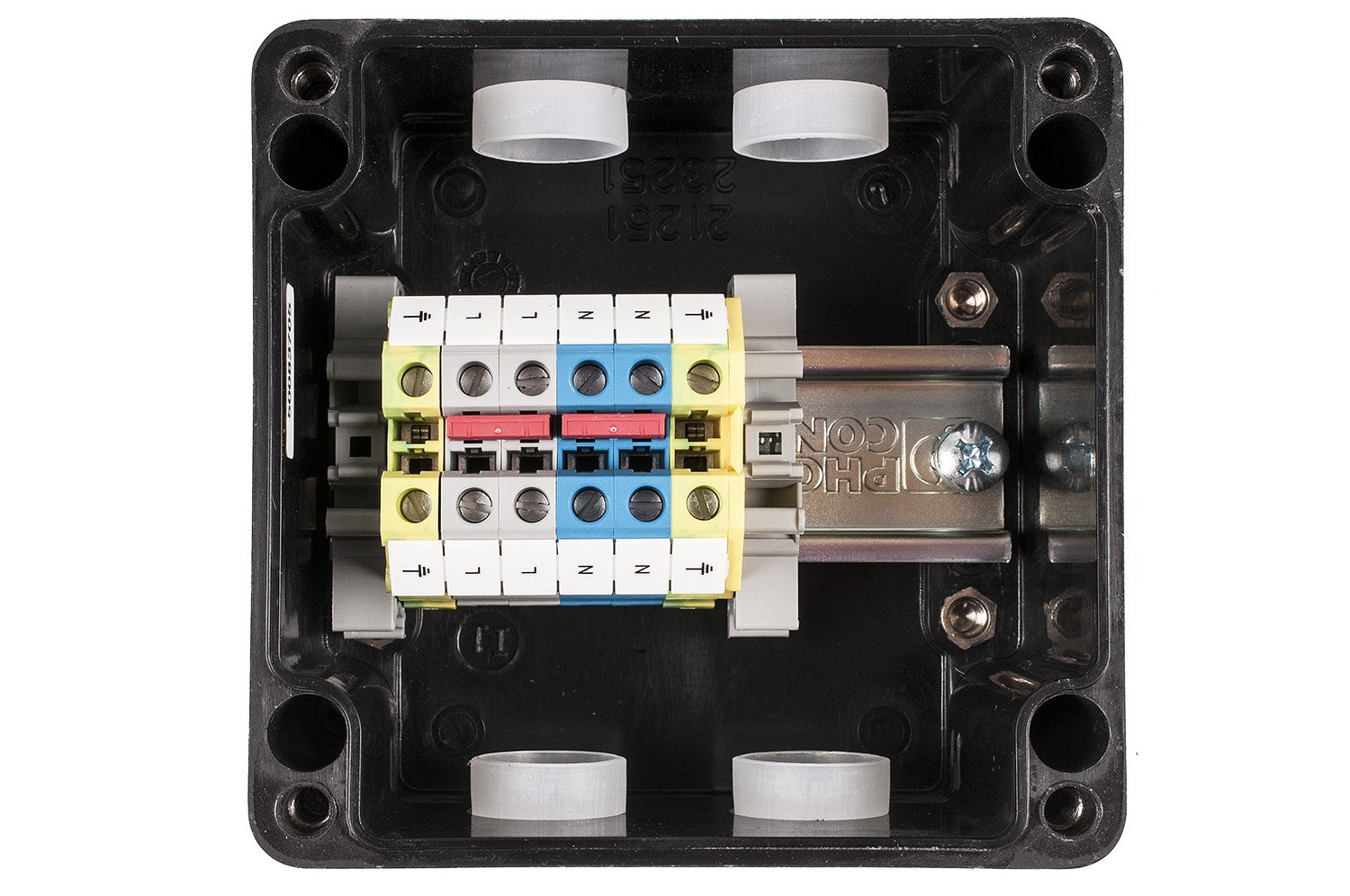 - Terminaalit: 4 x 6 mm² riviliitinterminaalit syötölle/kuormalle + 2 x 6 mm² maadoitusterminaalit