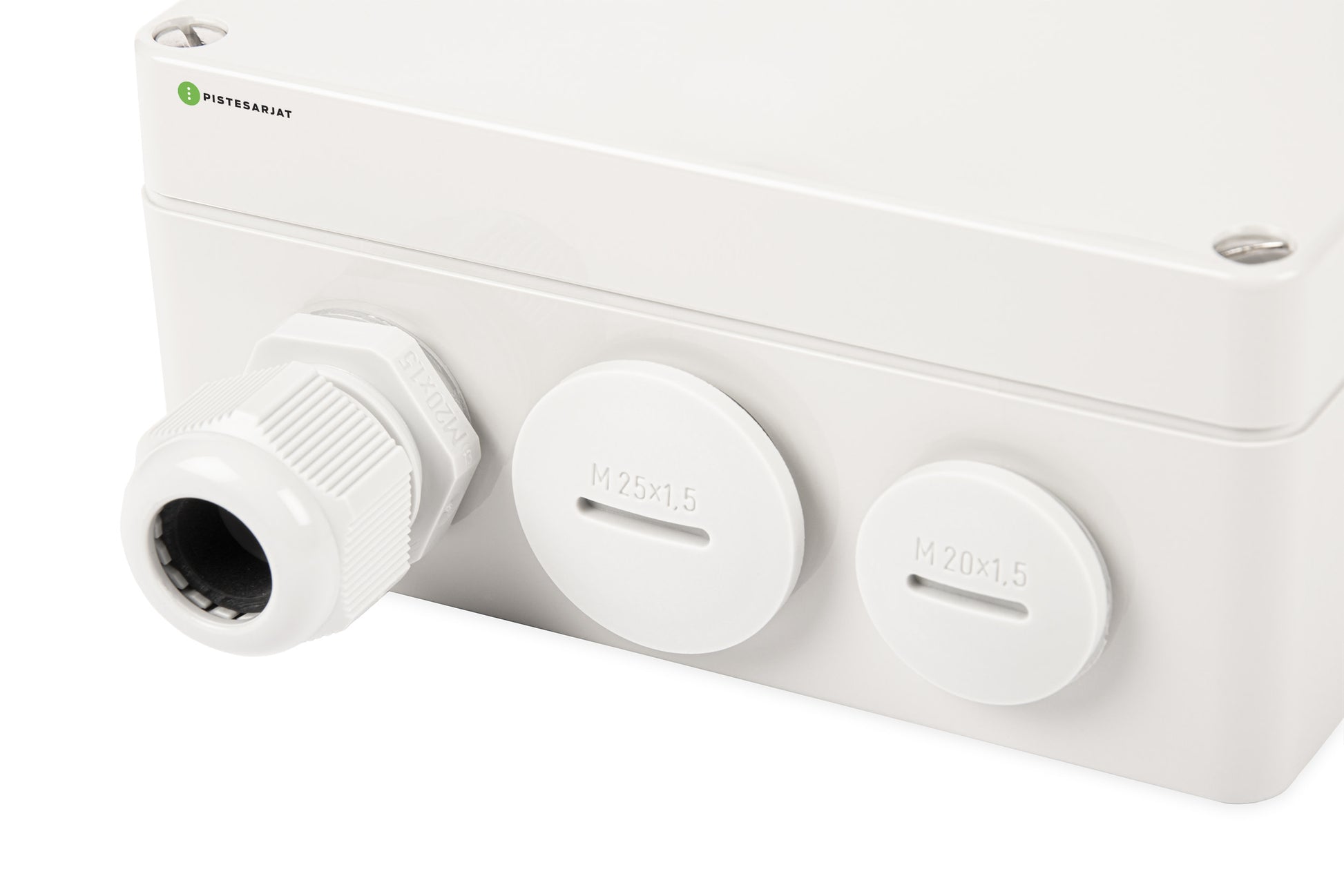Termostaattikotelon mukana tulee 1 kpl M20 läpivienti ja 2 x sokea tulppa (1 x M20 ja 1 x M24).