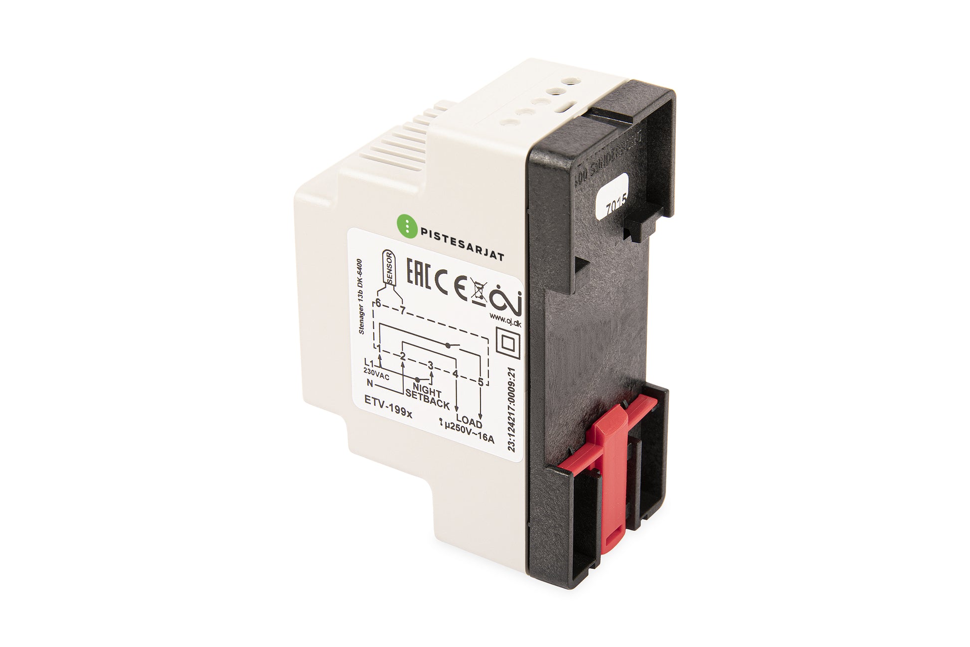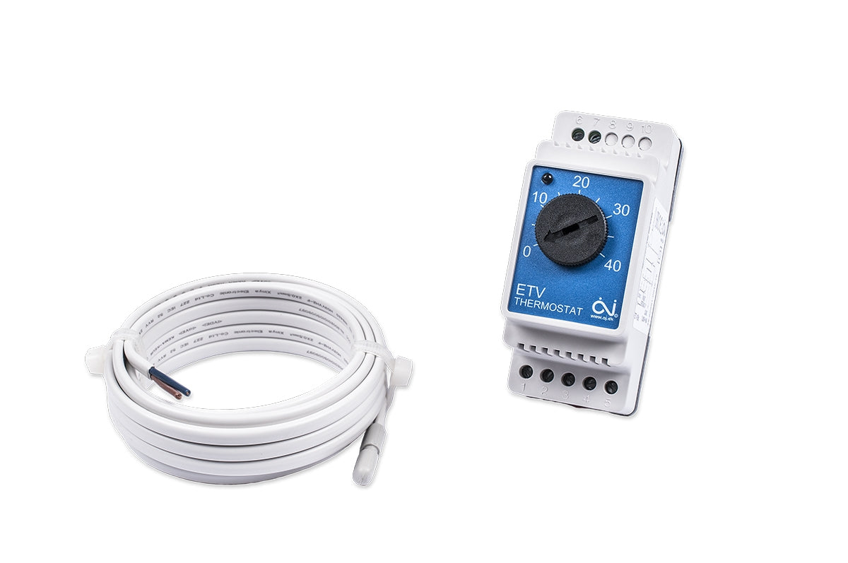 ETV termostaattia mukana tulevalla anturilla käytetään sähkölämmityksen sekä sulanapidon ohjaukseen. Termostaatti on DIN-kisko asenteinen, joten se on helppo sekä nopea asentaa joko keskukseen tai erilliseen asennuskoteloon. Termostaatissa on yksi sulkeutuva 16A rele.