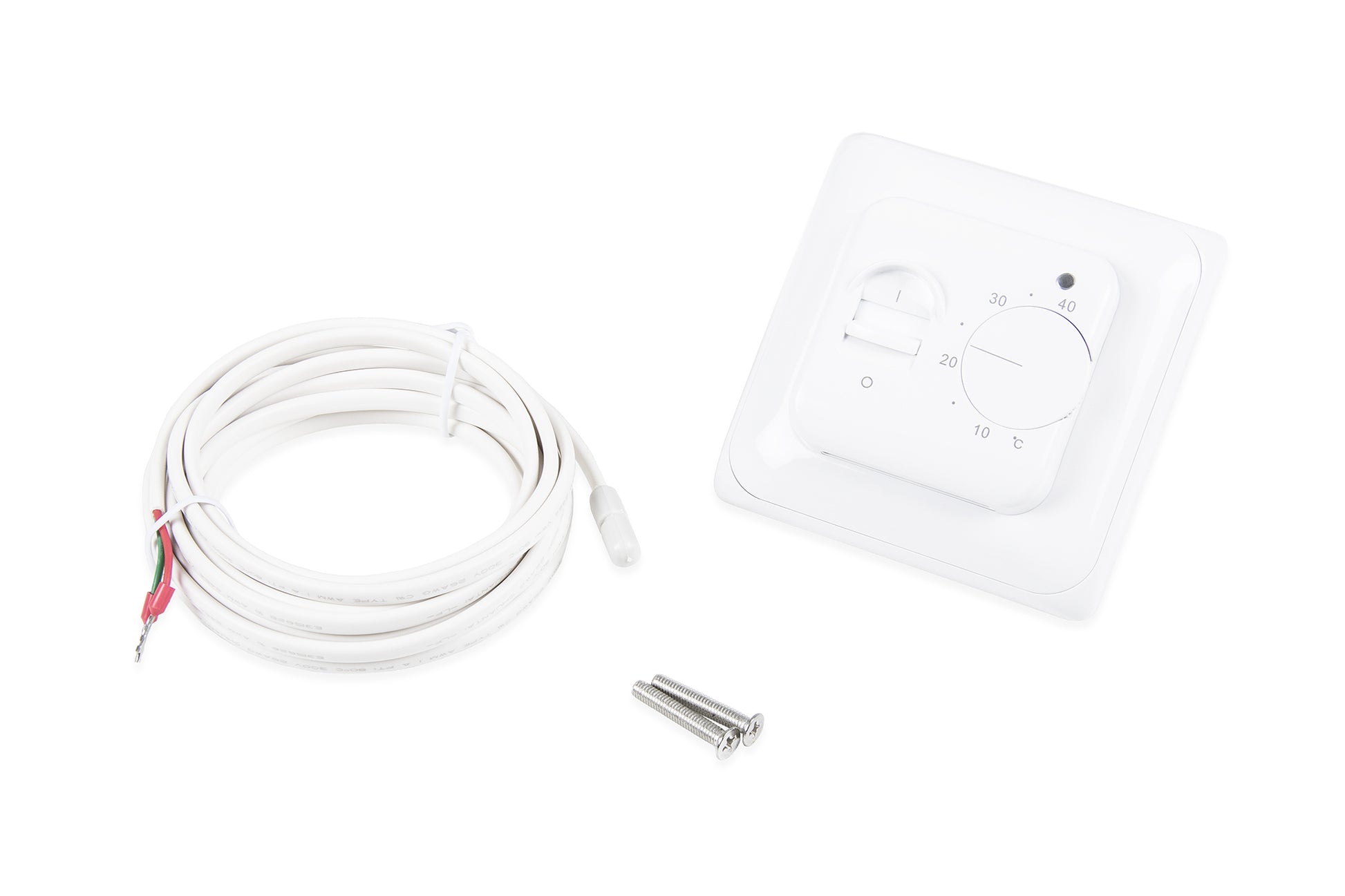 FS-2020 -termostaatti lattialämmityksen ohjaukseen. Virtakytkimellä varustetun termostaatin kytkentäreleen katkaisukyky on 16A / 3600W ja termostaatti toimitetaan 3 metrin lattia-anturilla. Termostaatin kotelointiluokka on IP 21. Termostaatissa on sisäinen suojaustoiminto joka katkaisee virransyötön mikäli lämpöanturi on viallinen. Termostaatin merkkivalo kertoo lämmityksen olevan käynnissä.