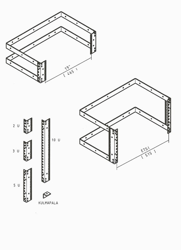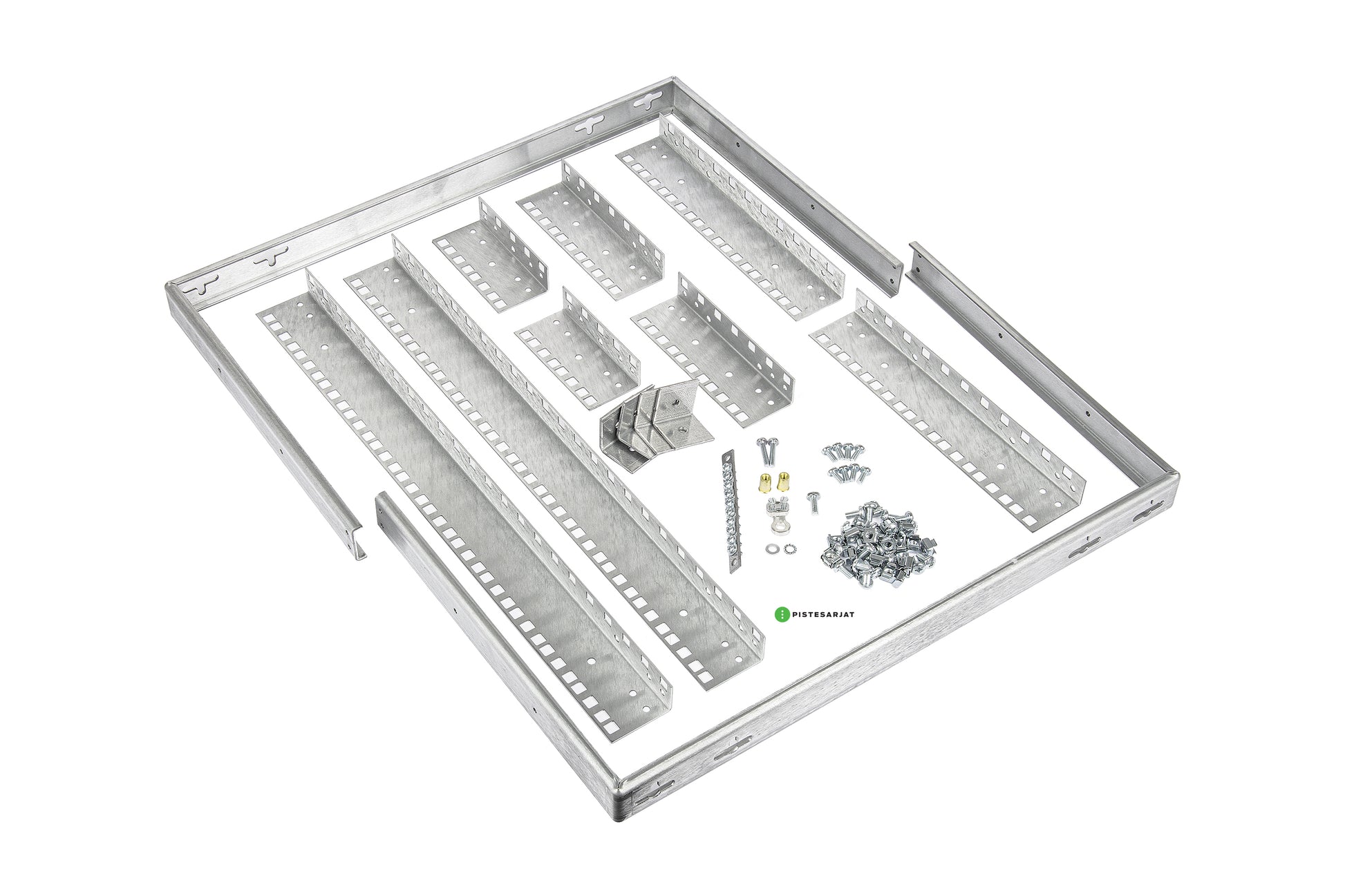 Mukana 4 eripituista kiskoparia joilla saadaan 2U – 12U moduulipaikkaa. Mukana myös seinäkiinnitysraudat, korimutterisarja (20kpl) ja maadoituskisko.
