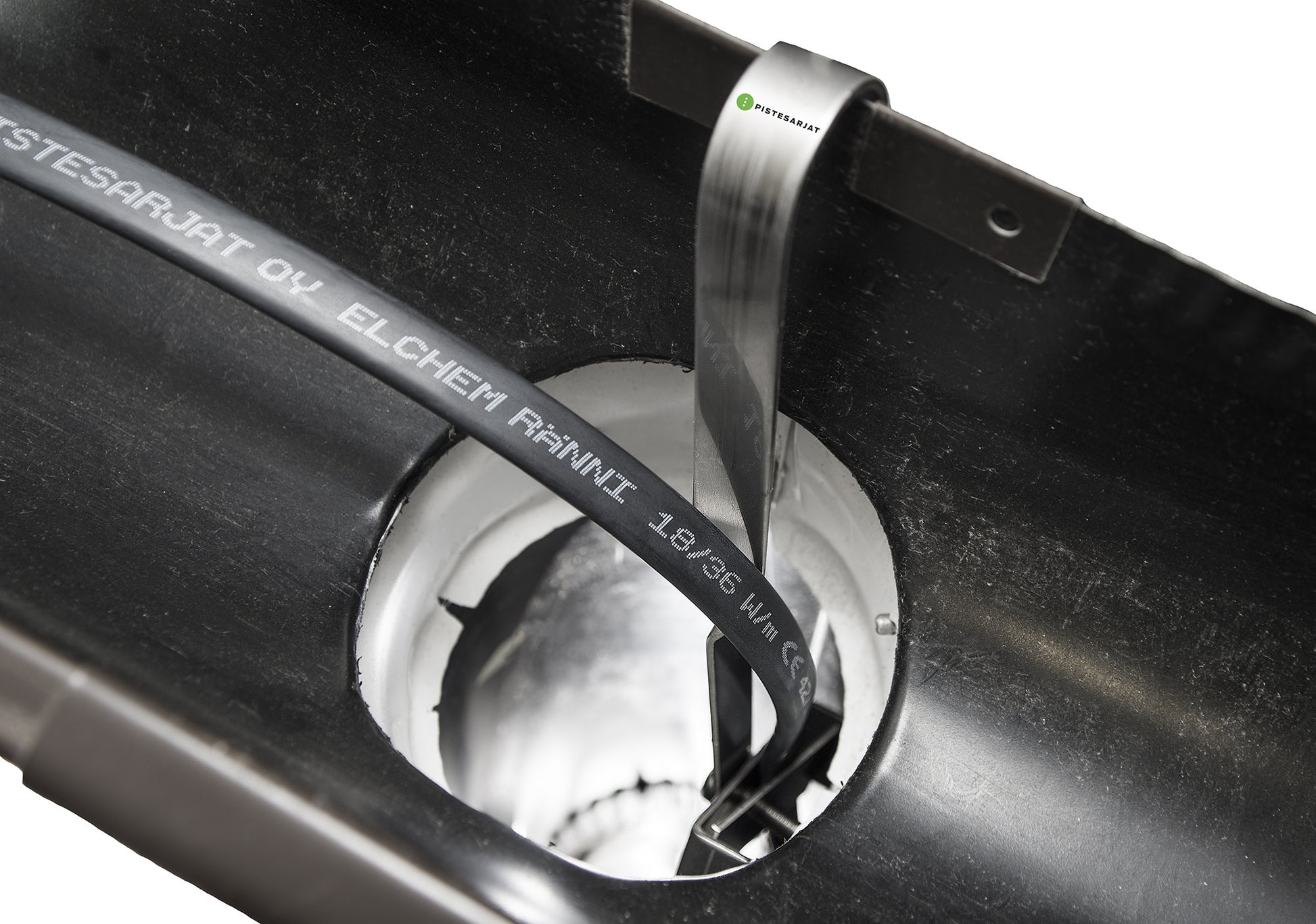 Vedonpoistokoukku itserajoittuvien sulanapitokaapeliden asennukseen. Vedonpoistokoukulla saadaan asennettua kaapelit syöksytorviin niin, ettei niihin ei kohdistu vetoa eikä kaapelin eristeet rikkoudu hankautuessaan teräviin reunoihin.